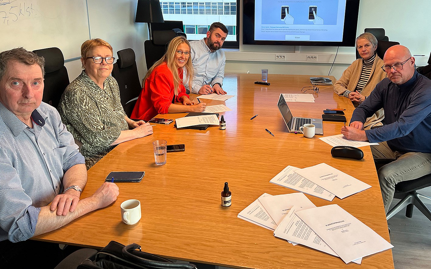 Frá undirritun kjarasamningsins í dag.Pétur Karlsson, trúnaðarmaður Sameykis hjá Strætó bs., Ágústa Sigurðardóttir, trúnaðmaður Sameykis hjá Strætó bs., Jenný Þórunn Stefánsdóttir, lögfræðingur í kjaradeild Sameykis, Ingólfur Björgvin Jónsson, deildarstjóri kjaradeildar Sameykis, Margrét Sigurðardóttir og Bjarni Ómar Haraldsson frá Samband íslenskra sveitarfélaga fyrir hönd Strætó bs.