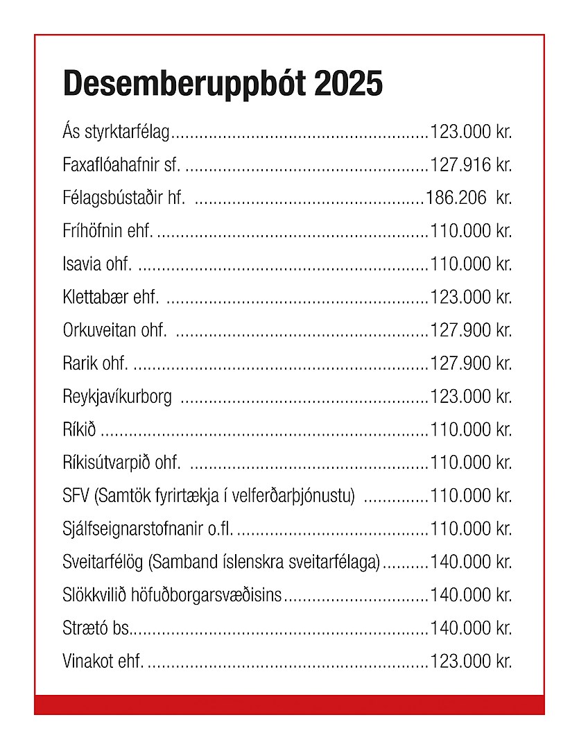 Desemberuppbót er föst krónutala og tekur ekki hækkunum samkvæmt öðrum ákvæðum kjarasamningsins og skal hún greidd út eigi síðar en 15. desember 2025.
