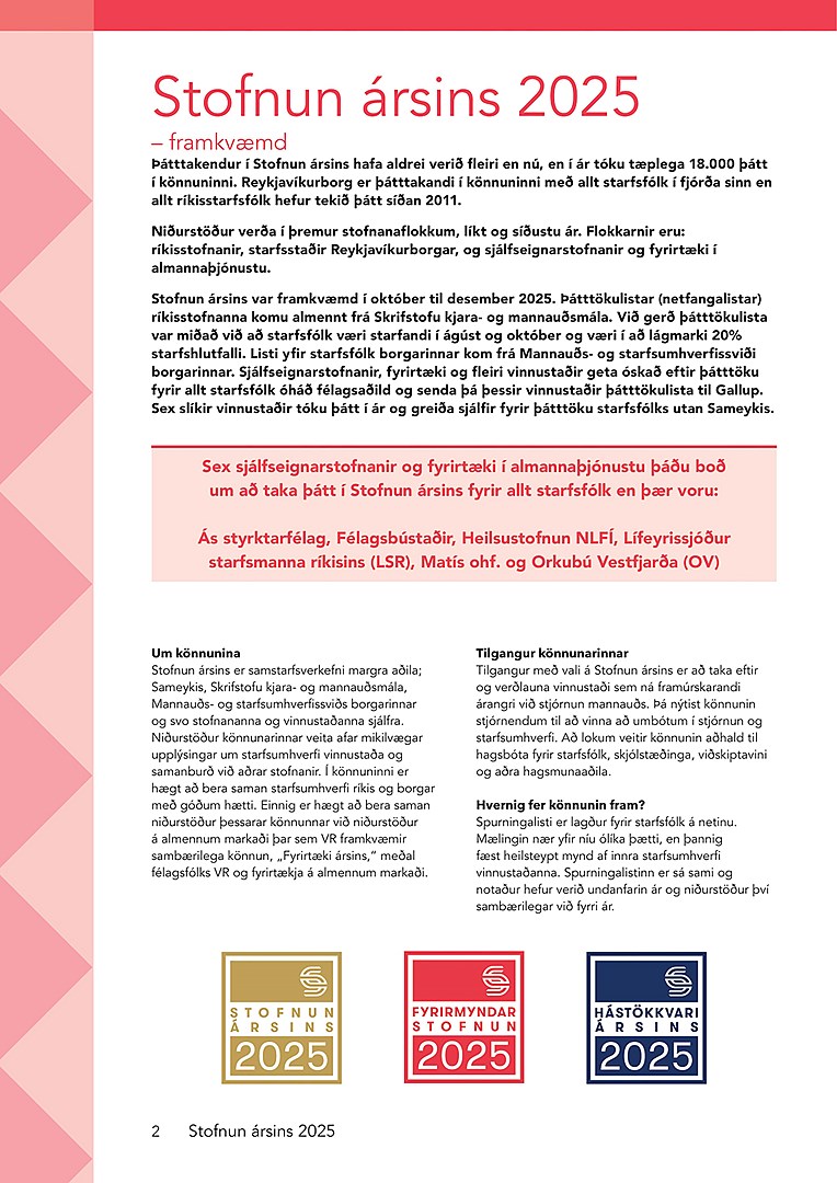 Niðurstöður Stofnun ársins 2025 senda skýr skilaboð um að opinberir vinnustaðir eru á réttri leið. Sterk stjórnun, góður starfsandi, jafnrétti og sveigjanleiki eru lykilþættir árangurs í mannauðsmálum og þar standa margir vinnustaðir landsins sig með miklum sóma.