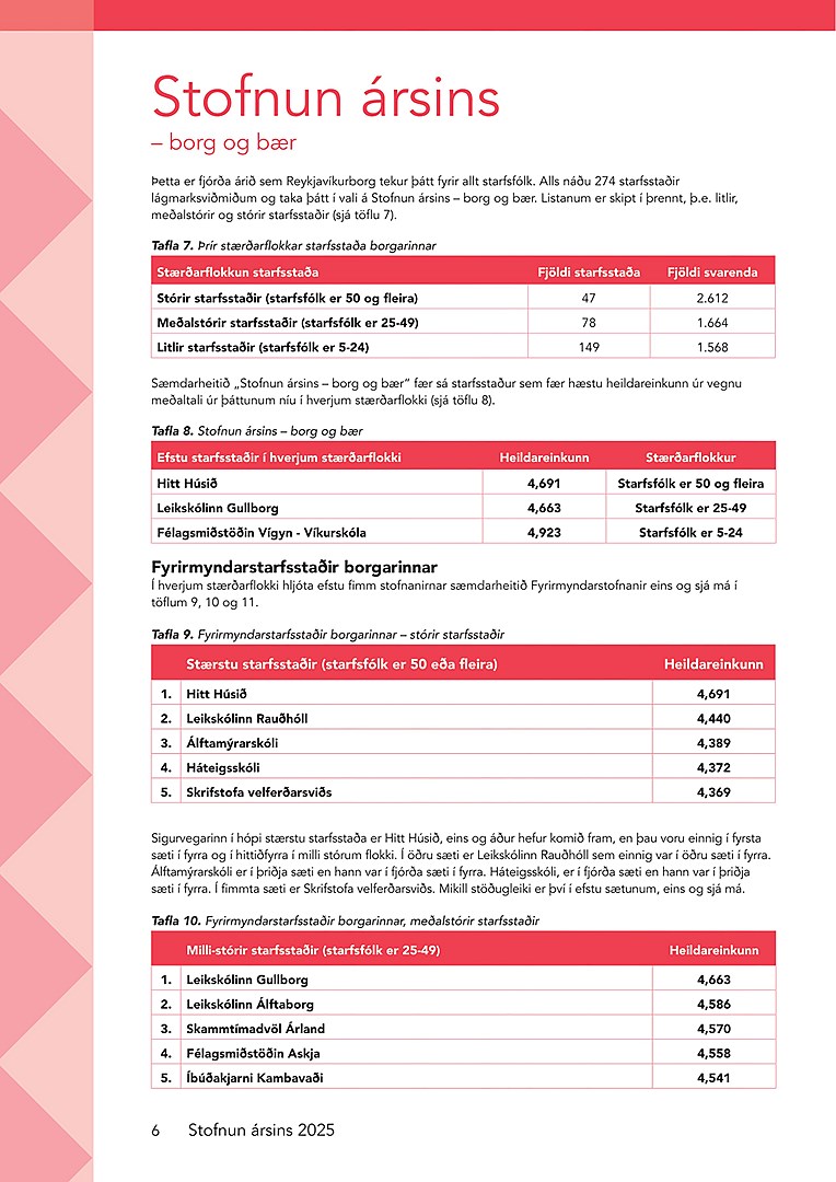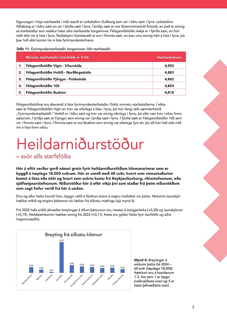 Sérstaklega má nefna hástökkvara ársins. Menntaskólinn í Reykjavík stekkur hæst meðal ríkisstofnana og Skammtímadvöl Árland hæst meðal starfsstaða borgarinnar. Það sýnir að markviss umbótavinna getur skilað skjótum og mælanlegum árangri.