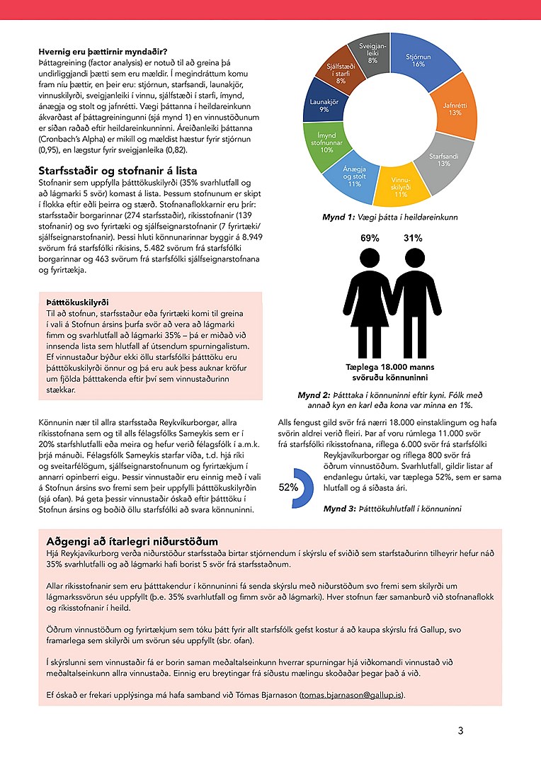 Launakjör eru áfram sá þáttur sem mælist lægstur, en hann hækkar þó mest milli ára og hefur aldrei verið hærri en nú. Eitt skýrasta mynstrið í niðurstöðunum er að minni vinnustaðir fá almennt hærri heildareinkunn en stærri vinnustaðir. Þá eru yngstu starfsmennirnir og stjórnendur að jafnaði ánægðari en aðrir hópar samkvæmt niðurstöðunum.