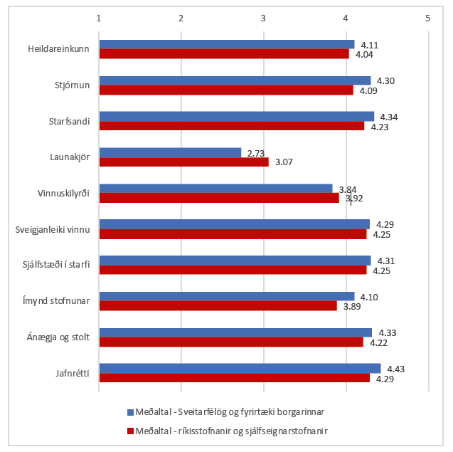Meðaleinkunn stofnana sveitarfélaga og fyrirtækja borgarinnar er lítið eitt hærri en hjá ríki og sjálfseignarstofnunum, eða 4,11, og stendur nokkurn veginn í stað frá því í fyrra. Heildareinkunn sveitarfélaga og fyrirtækja borgarinnar hefur hækkað mikið á undanförnum árum, eða um 0,18 stig frá 2016. Líkt og hjá ríkisstofnunum hækkar ímynd milli ára en viðhorf til launakjara batnar hjá sveitarfélögum og fyrirtækjum borgarinnar milli ára sem er ólíkt því sem við sjáum í niðurstöðum ríkisstofnana.