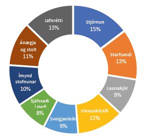 Þáttagreining (factor analysis) var notuð til að greina þá undirliggjandi þætti sem eru mældir. Í megindráttum komu fram níu þættir, en þeir eru: stjórnun, starfsandi, launakjör, vinnuskilyrði, sveigjanleiki vinnu, sjálfstæði í starfi, ímynd stofnunar, ánægja og stolt og jafnrétti. Vægi